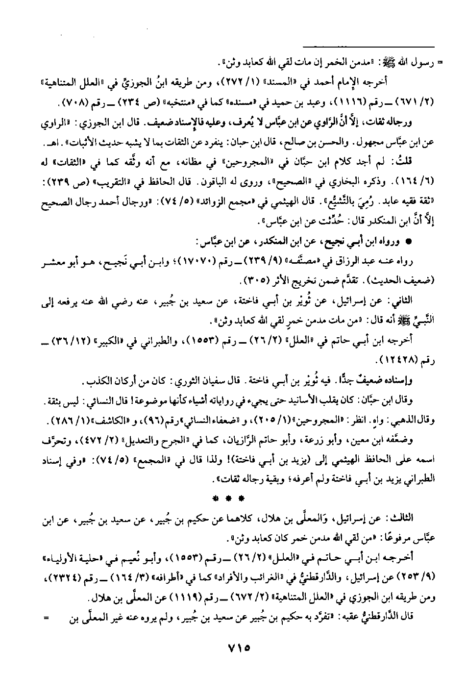 الثالث: عن إسرائيل، وَالمعلَّى بن هلال، كلاهما عن حكيم بن جُبير، عن سعيد بن جُبير، عن ابن عبَّاس مرفوعًا: "من لقي الله مدمن خمر كان كعابد وثن".