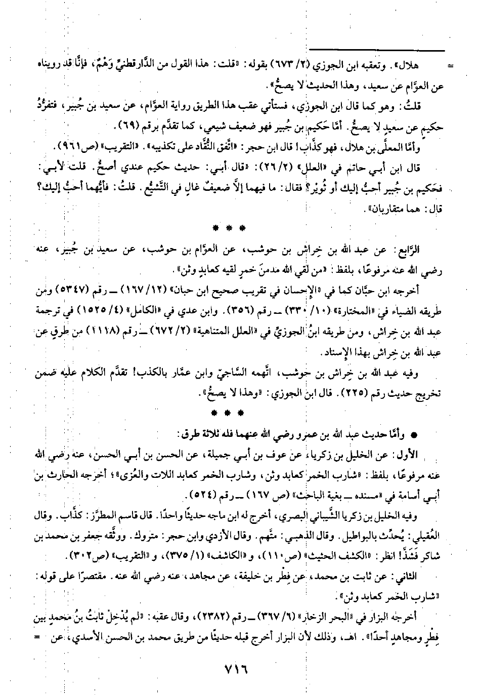 الرَّابع: عن عبد الله بن خِراش بن حوشب، عن العوَّام بن حوشب، عن سعيد بن جُبير، عنه رضي الله عنه مرفوعًا، بلفظ: "من لقي الله مدمنَ خمرٍ لقيه كعابدٍ وثن".