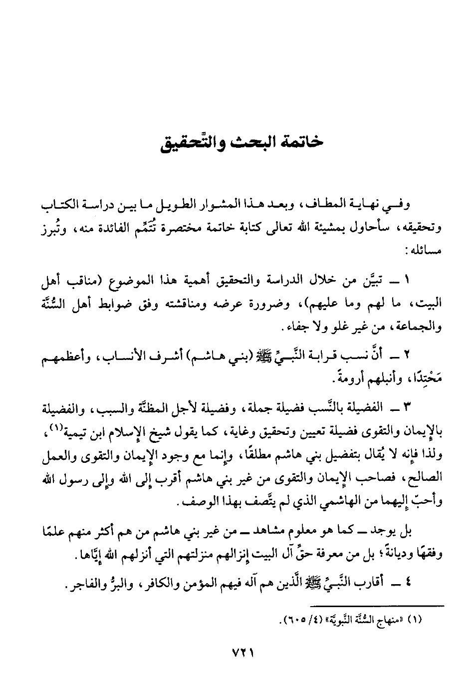 ١ - تبيَّن من خلال الدراسة والتحقيق أهمية هذا الموضوع (مناقب أهل البيت، ما لهم وما عليهم)، وضرورة عرضه ومناقشته وفق ضوابط أهل السُّنَّة والجماعة، من غير غلو ولا جفاء.