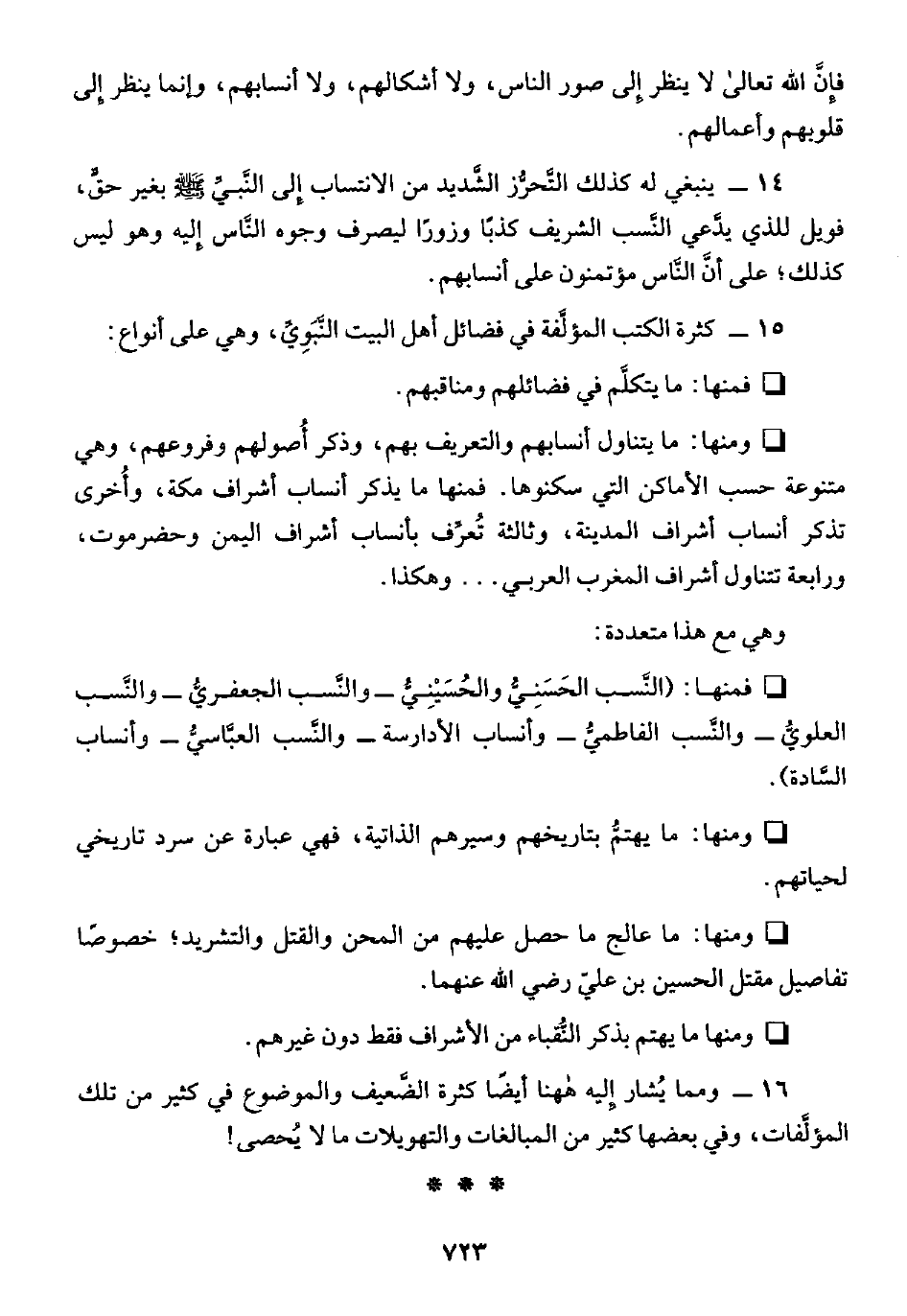 ١٤ - ينبغي له كذلك التَّحرُّز الشَّديد من الانتساب إلى النَّبيِّ -صلى الله عليه وسلم- بغير حقٍّ، فويل للذي يدَّعي النَّسب الشريف كذبًا وزورًا ليصرف وجوه النَّاس إليه وهو ليس كذلك؛ على أنِّ النَّاس مؤتمنون على أنسابهم.