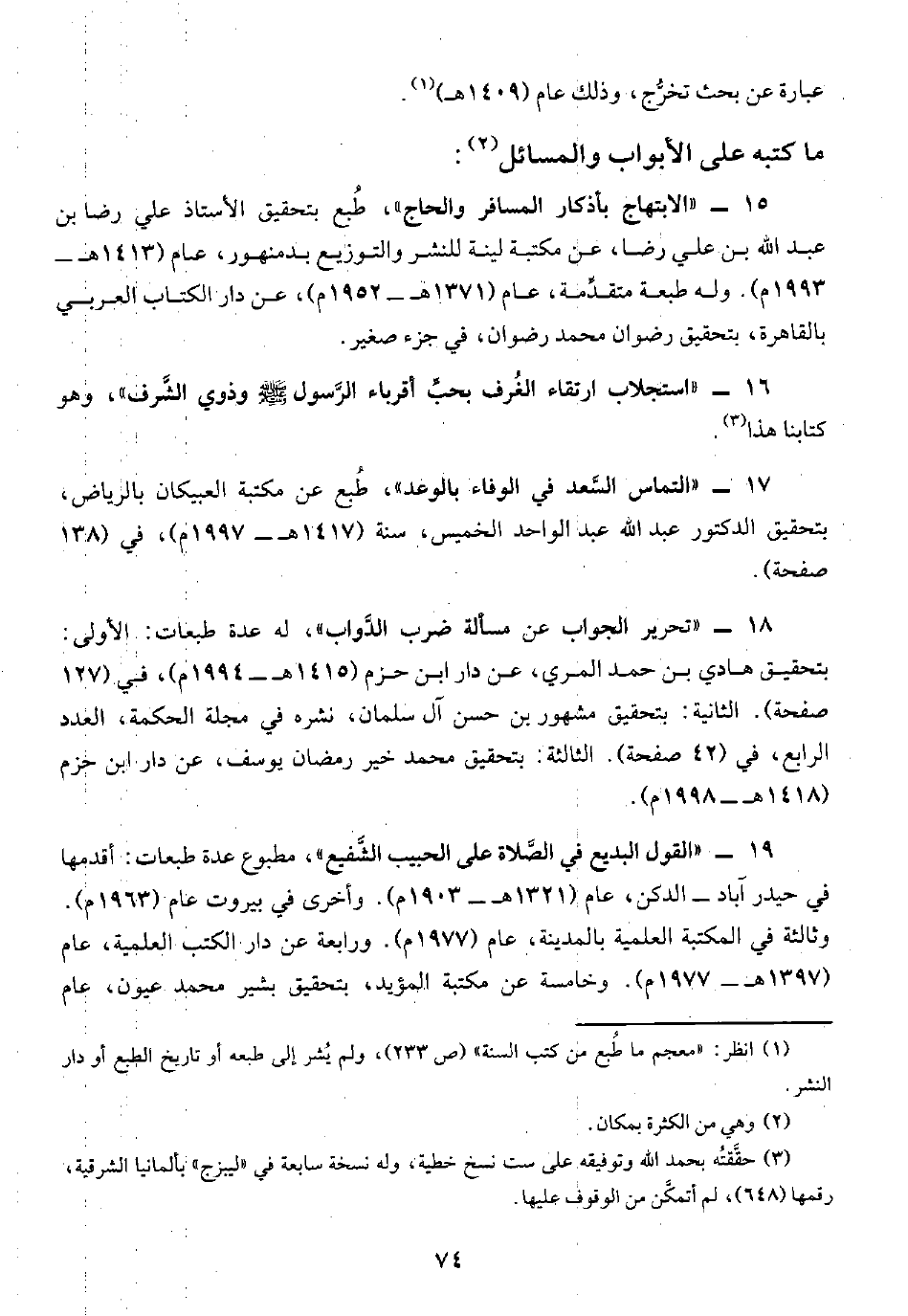١٥ - " الابتهاج بأذكار المسافر والحاج"، طُبع بتحقيق الأستاذ علي رضا بن عبد الله بن علي رضا، عن مكتبة لينة للنشر والتوزيع بدمنهور، عام (١٤١٣ هـ - ١٩٩٣ م). وله طبعة متقدمة، عام (١٣٧١ هـ - ١٩٥٢ م)، عن دار الكتاب العربي بالقاهرة، بتحقيق رضوان محمد رضوان، في جزء صغير.