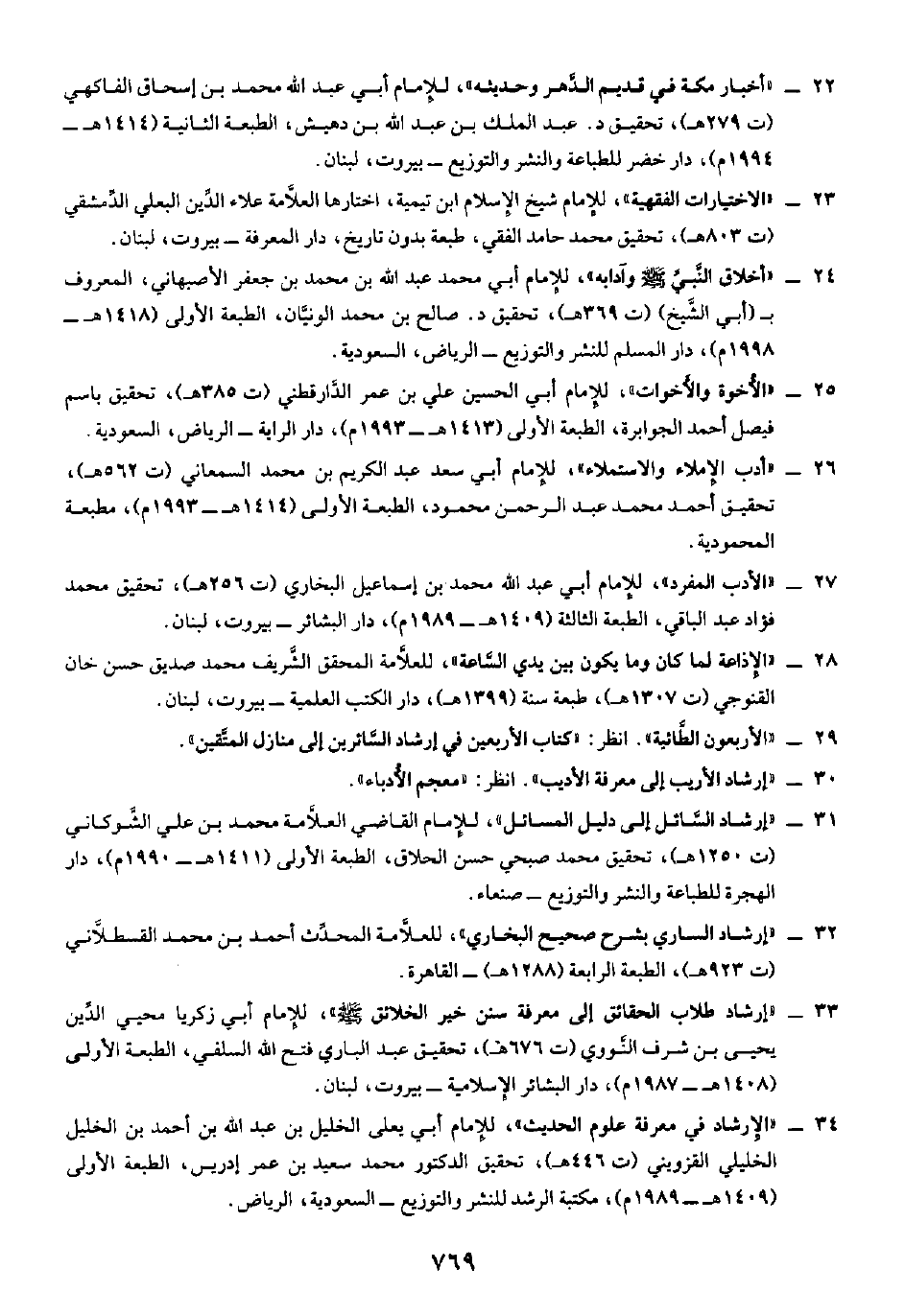 ٣٤ - "الإرشاد في معرفة علوم الحديث"، للإمام أبي يعلى الخليل بن عبد الله بن أحمد بن الخليل الخليلي القزويني (ت ٤٤٦ هـ)، تحقيق الدكتور محمد سعيد بن عمر إدريس، الطبعة الأولى (١٤٠٩ هـ -١٩٨٩ م)، مكنت الرشد للنشر والتوزيع - السعودية، الرياض.
