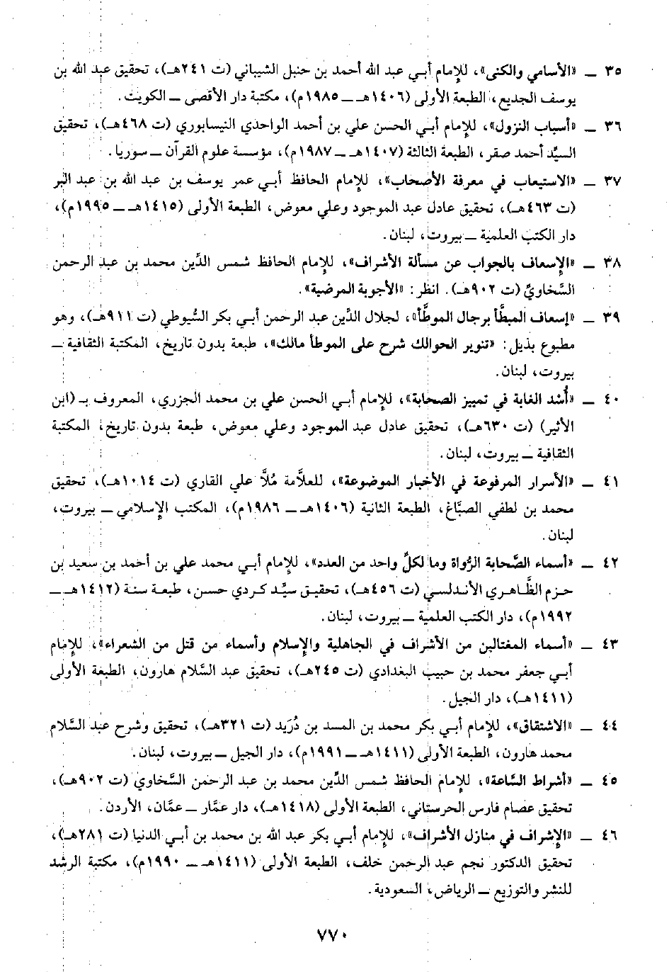 ٣٩ - "إسعاف المبطَّأ برجال الموطَّأ"، لجلال الدِّين عبد الرحمن أبي بكر السُّيوطي (ت ٩١١ هـ)، وهو مطبوع بذيل: "تنوير الحوالك شرح على الموطأ مالك"، طبعة بدون تاريخ، المكتبة الثقافية - بيروت، لبنان.