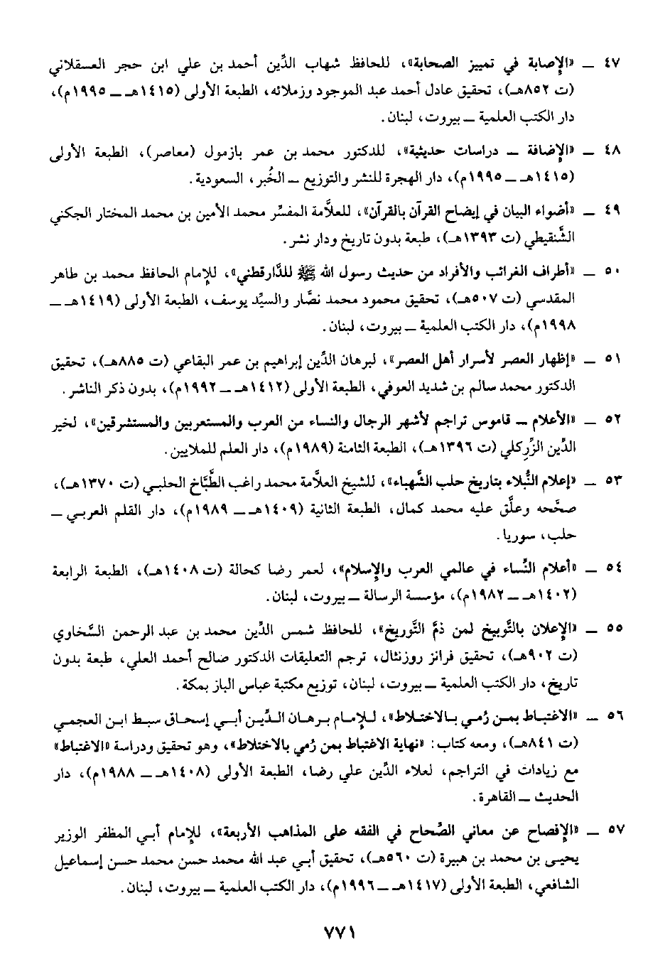 ٤٧ - "الإصابة في تمييز الصحابة"، للحافظ شهاب الدِّين أحمد بن علي ابن حجر العسقلاني (ت ٨٥٢ هـ)، تحقيق عادل أحمد عبد الموجود وزملائه، الطبعة الأولى (١٤١٥ هـ - ١٩٩٥ م)، دار الكتب العلمية - بيروت، لبنان.