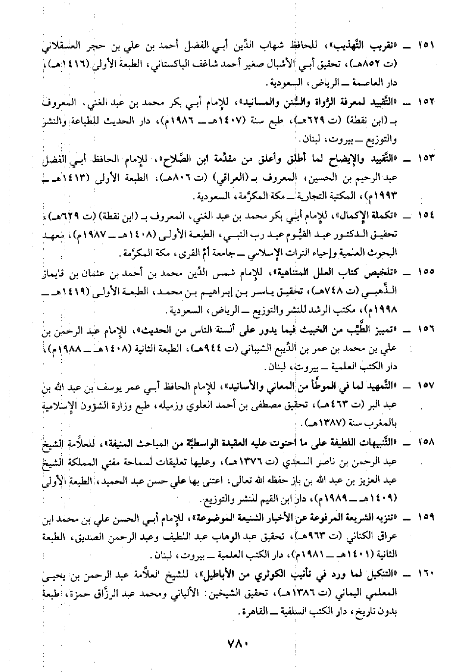 ١٦٠ - "التنكيل لما ورد في تأنيب الكوثري من الأباطيل"، للشيخ العلَّامة عبد الرحمن بن يحيى المعلمي اليماني (ت ١٣٨٦ هـ)، تحقيق الشيخين: الألباني ومحمد عبد الرزَّاق ححزة، طبعة بدون تاريخ، دار الكتب السلفية - القاهرة.
