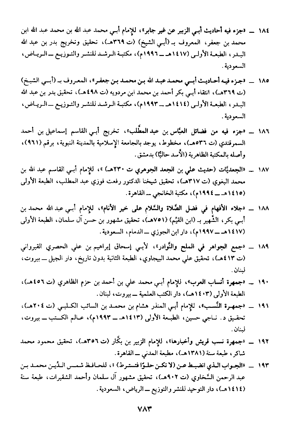 ١٩١ - "جمهرة النَّسب"، للإمام أبي المنذر هشام بن محمد بن السائب الكلبي (ت ٢٠٤ هـ)، تحقيق د. ناجي حسين، الطبعة الأولى (١٤١٣ هـ -١٩٩٣ م)، عالم الكتب - بيروت، لبنان.