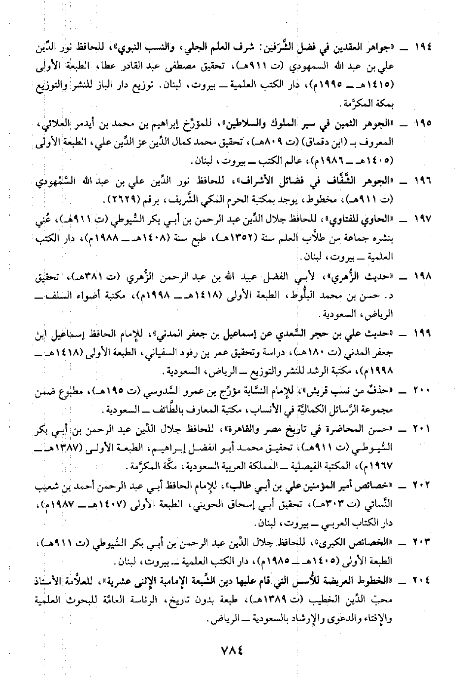 ١٩٤ - "جواهر العقدين في فضل الشَّرَفين: شرف العلم الجلي، والنسب النبوي"، للحافظ نور الدِّين علي بن عبد الله السمهودي (ت ٩١١ هـ)، تحقيق مصطفى عبد القادر عطا، الطبعة الأولى (١٤١٥ هـ - ١٩٩٥ م)، دار الكتب العلمية - بيروت، لبنان. توزيع دار الباز للنشر والتوزيع بمكة المكرَّمة.