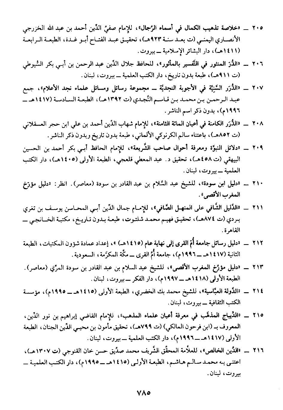 ٢٠٥ - "خلاصة تهذيب الكمال في أسماء الرِّجال"، للإمام صفيِّ الدِّين أحمد بن عبد الله الخزرجي الأنصاري اليمني (ت بعد سنة ٩٢٣ هـ)، تحقيق عبد الفتاح أبو غدة، الطبعة الرابعة (١٤١١ هـ)، دار البشائر الإسلامية - بيروت.