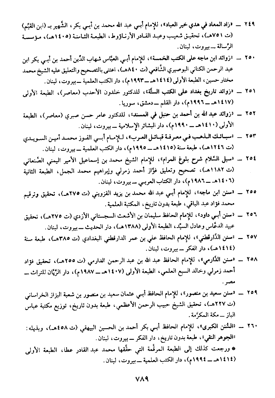 ٢٤٩ - "زاد المعاد في هدي خير العباد"، للإمام أبي عبد الله محمد بن أبي بكر، الشَّهير بـ (ابن القيم) (ت ٧٥١ هـ)، تحقيق شعيب وعبد القادر الأرناؤوط، الطبعة الثامنة (١٤٠٥ هـ)، مؤسسة الرِّسالة - بيروت، لبنان.