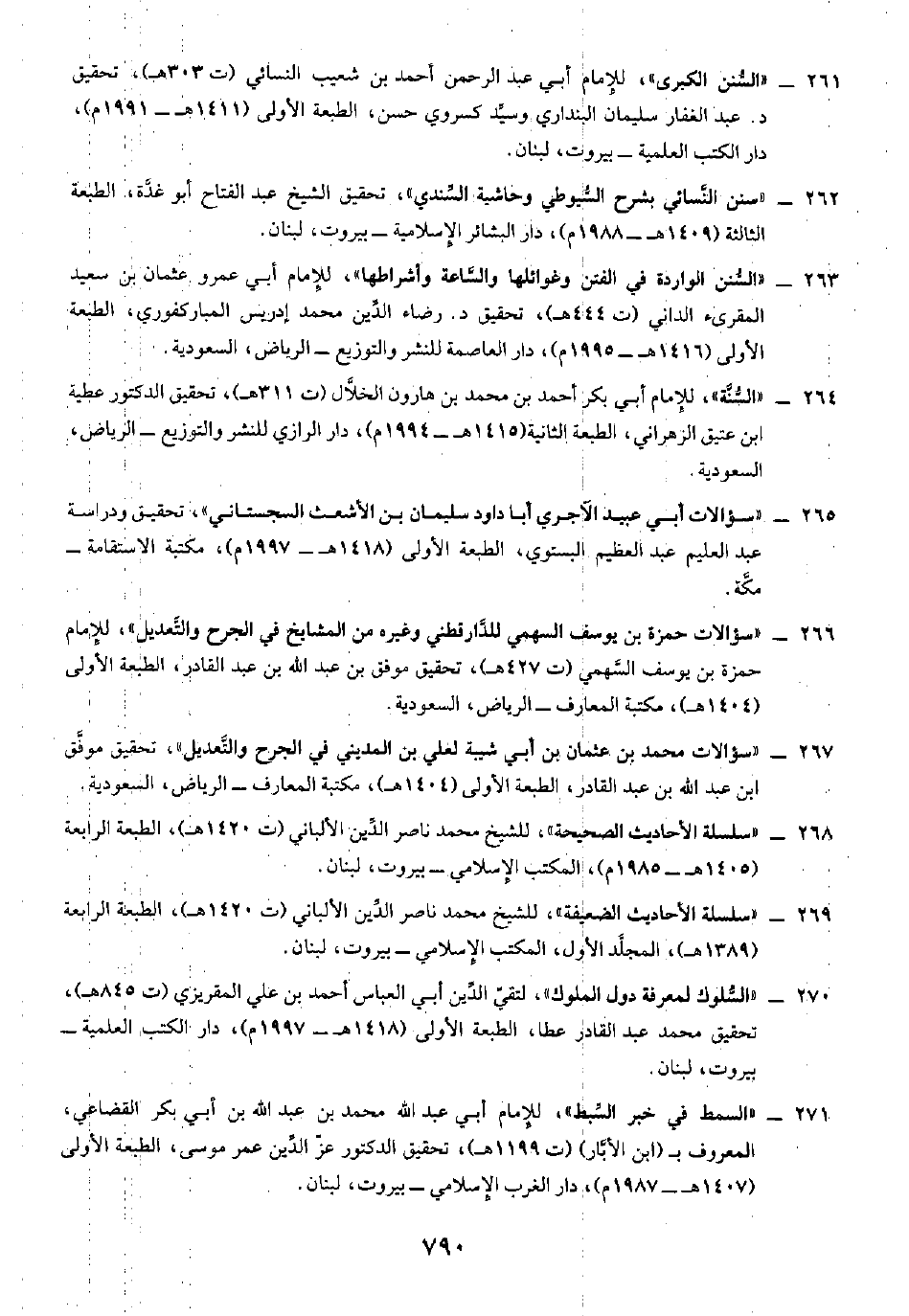 ٢٦٢ - "سنن النَّسائي بشرح السُّيوطي وحاشية السِّندي"، تحقيق الشيخ عبد الفتاح أبو غدَّة، الطبعة الثالثة (١٤٠٩ هـ - ١٩٨٨ م)، دار البشائر الإسلامية - بيروت، لبنان.