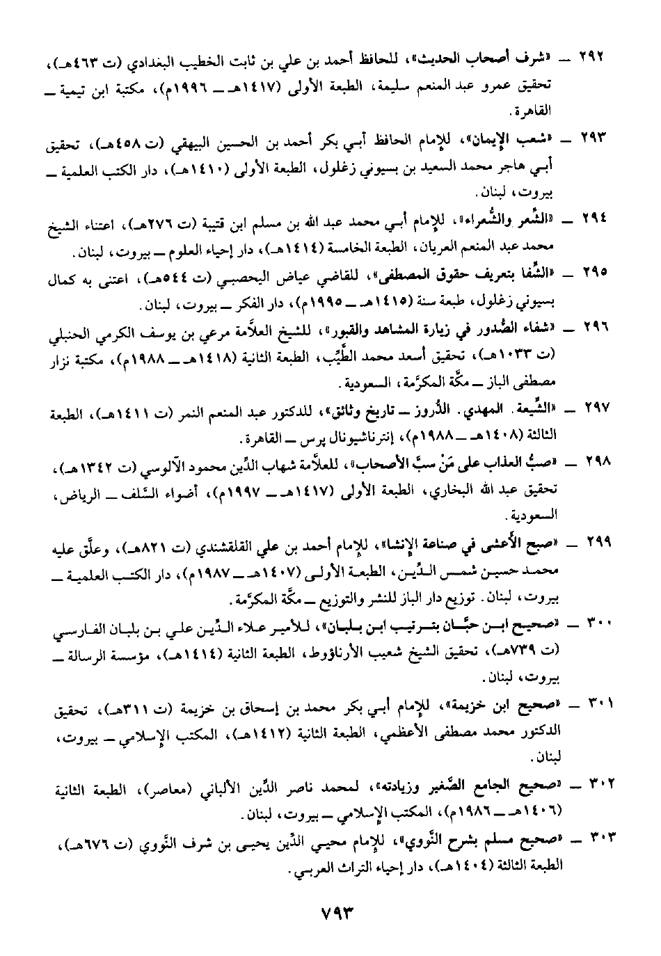 ٢٩٣ - "شعب الإيمان", للإمام الحافظ أبي بكر أحمد بن الحسين البيهقي (ت ٤٥٨ هـ)، تحقيق أبي هاجر محمد السعيد بن بسيوني زغلول، الطبعة الأولى (١٤١٠ هـ)، دار الكتب العلمية- بيروت، لبنان.