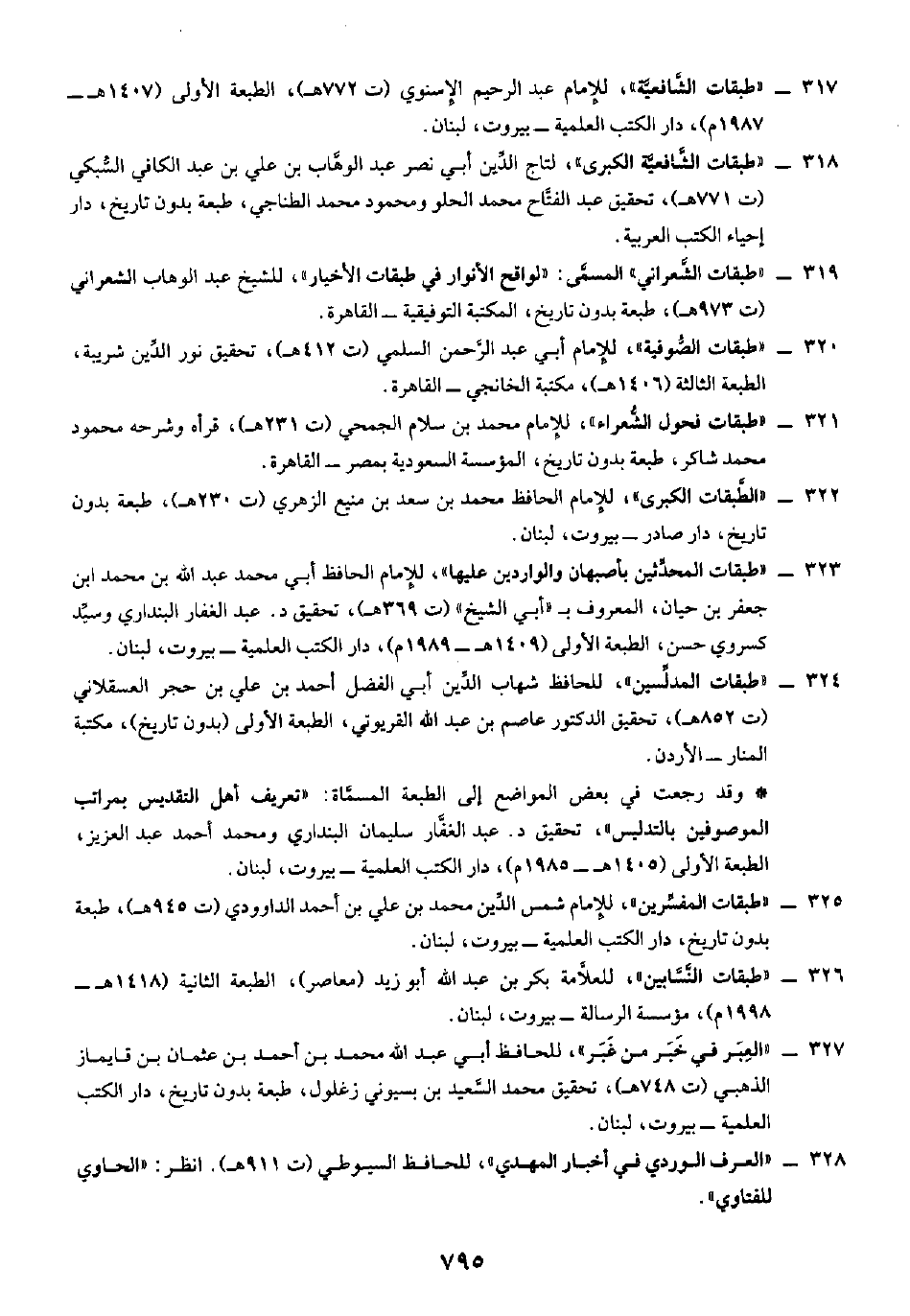 ٣١٧ - "طبقات الشافعية"، للإمام عبد الرحيم الإسنوي (ت ٧٧٢ هـ)، الطبعة الأولى (١٤٠٧ هـ - ١٩٨٧ م)، دار الكتب العلمية- بيروت، لبنان.
