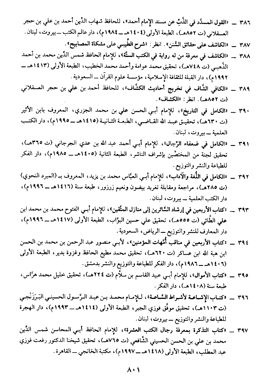 ٣٨٨ - "الكاشف في معرفة من له رواية في الكتب الستَّة"، للإمام الحافظ شمس الدين محمد بن أحمد الذهبي (ت ٧٤٨ هـ)، تحقيق محمد عوامة وأحمد محمد الخطيب، الطبعة الأولى (١٤١٣ هـ - ١٩٩٢ م)، دار القبلة للثقافة الإسلامية، مؤسسة علوم القرآن- السعودية.