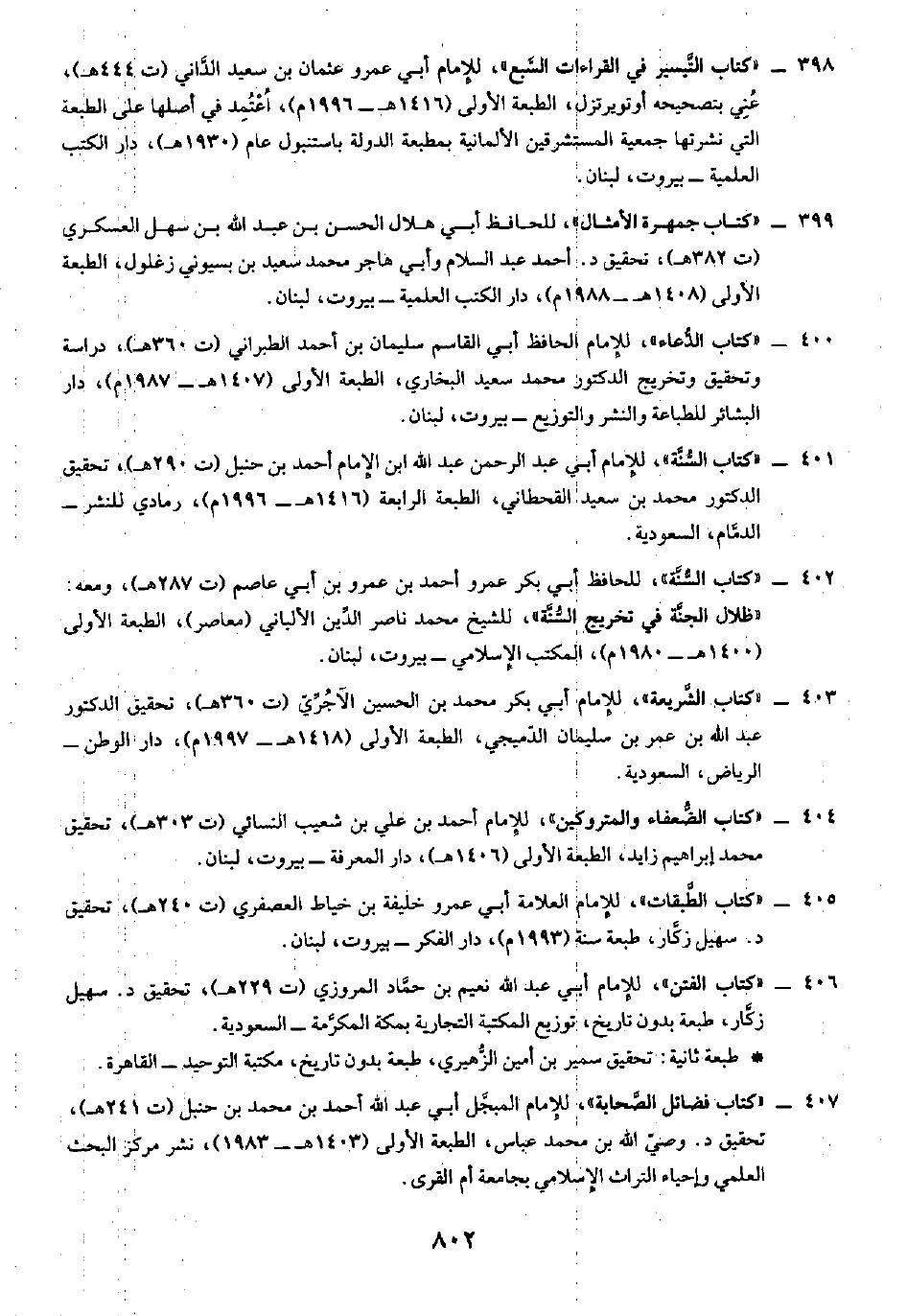 ٤٠٢ - "كتاب السنة"، للحافظ أبي بكر عمرو أحمد بن عمرو بن أبي عاصم (ت ٢٨٧ هـ)، ومعه: "ظلال الجنَّة في تخريج السنة"، للشيخ محمد ناصر الدين الألباني (معاصر)، الطبعة الأولى (١٤٠٠ هـ - ١٩٨٠ م)، المكتب الإسلامي- بيروت، لبنان.