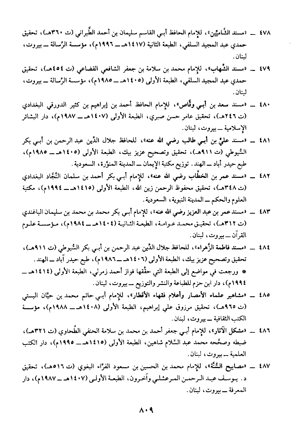 ٤٨٥ - "مشاهير علماء الأمصار وأعلام فقهاء الأقطار"، للإمام أبي حاتم محمد بن حبَّان البستي (ت ٩٦٥ هـ)، تحقيق مرزوق علي إبراهيم، الطبعة الأولى (١٤٠٨ هـ - ١٩٨٨ م)، مؤسسة الكتب الثقافية - بيروت، لبنان.