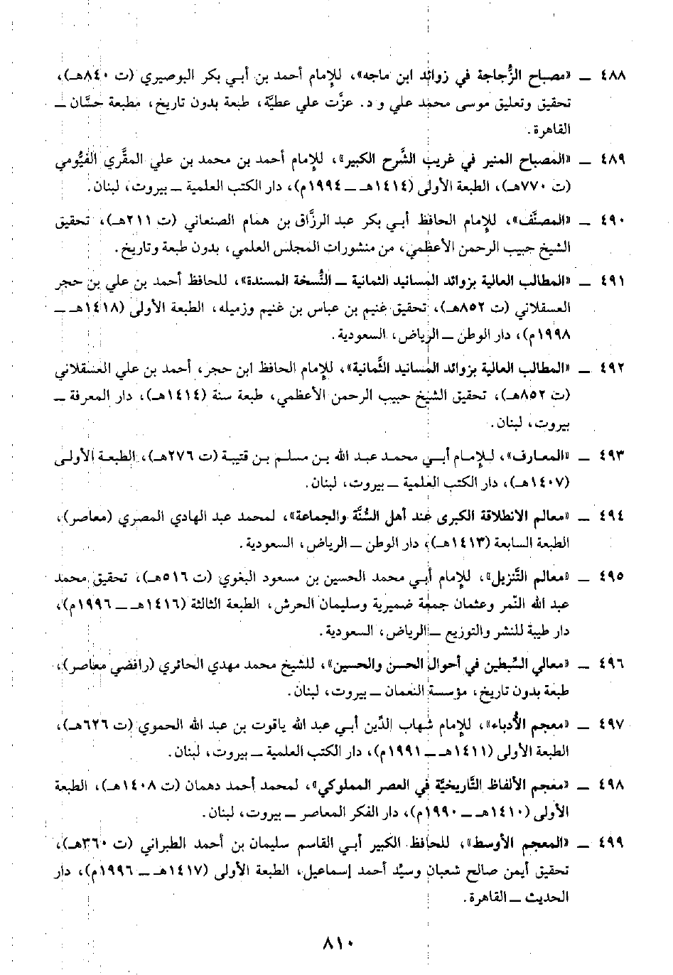٤٨٨ - "مصباح الزجاجة في زوائد ابن ماجه"، للإمام أحمد بن أبي بكر البوصيري (ت ٨٤٠ هـ)، تحقيق وتعليق موسى محمد علي ود. عزَّت علي عطيَّة، طبعة بدون تاريخ، مطبعة حسَّان - القاهرة.