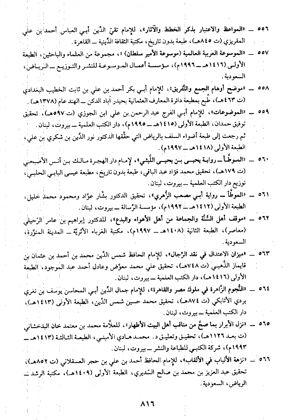 ٥٦٠ - "الموطَّأ - رواية يحيى بن يحيى اللَّيثى"، لإمام دار الهجرة مالك بن أبى الأصبحي (ت ١٧٩ هـ)، تحقيق محمد فؤاد عبد الباقي، طبعة بدون تاريخ، مطبعة عيسى البابي الحلبي، توزيع دار الكتب العلمية - بيروت، لبنان.