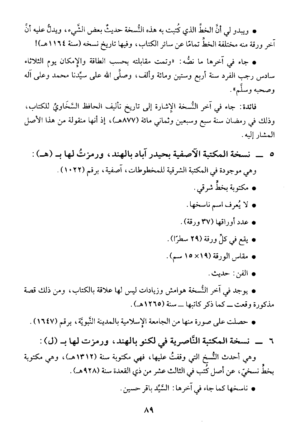 ٥ - نسخة المكتبة الآصفية بحيدر آباد بالهند، ورمزتُ لها بـ (هـ): وهي موجودة في المكتبة الشرقية للمخطوطات، آصفية، برقم (١٠٢٢).