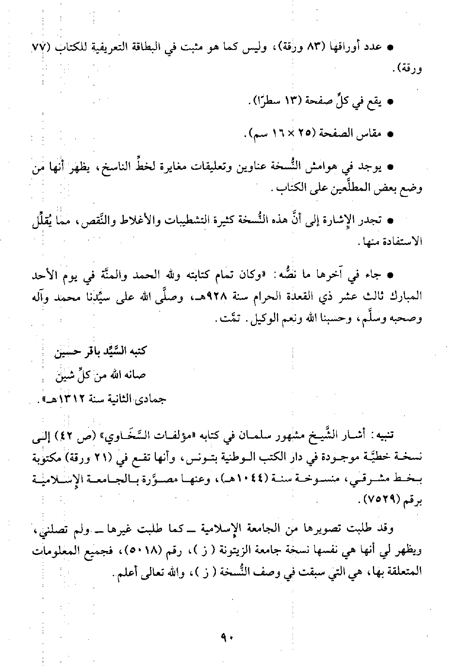 • عدد أوراقها (٨٣ ورقة)، وليس كما هو مثبت في البطاقة التعريفية للكتاب (٧٧ ورقة).