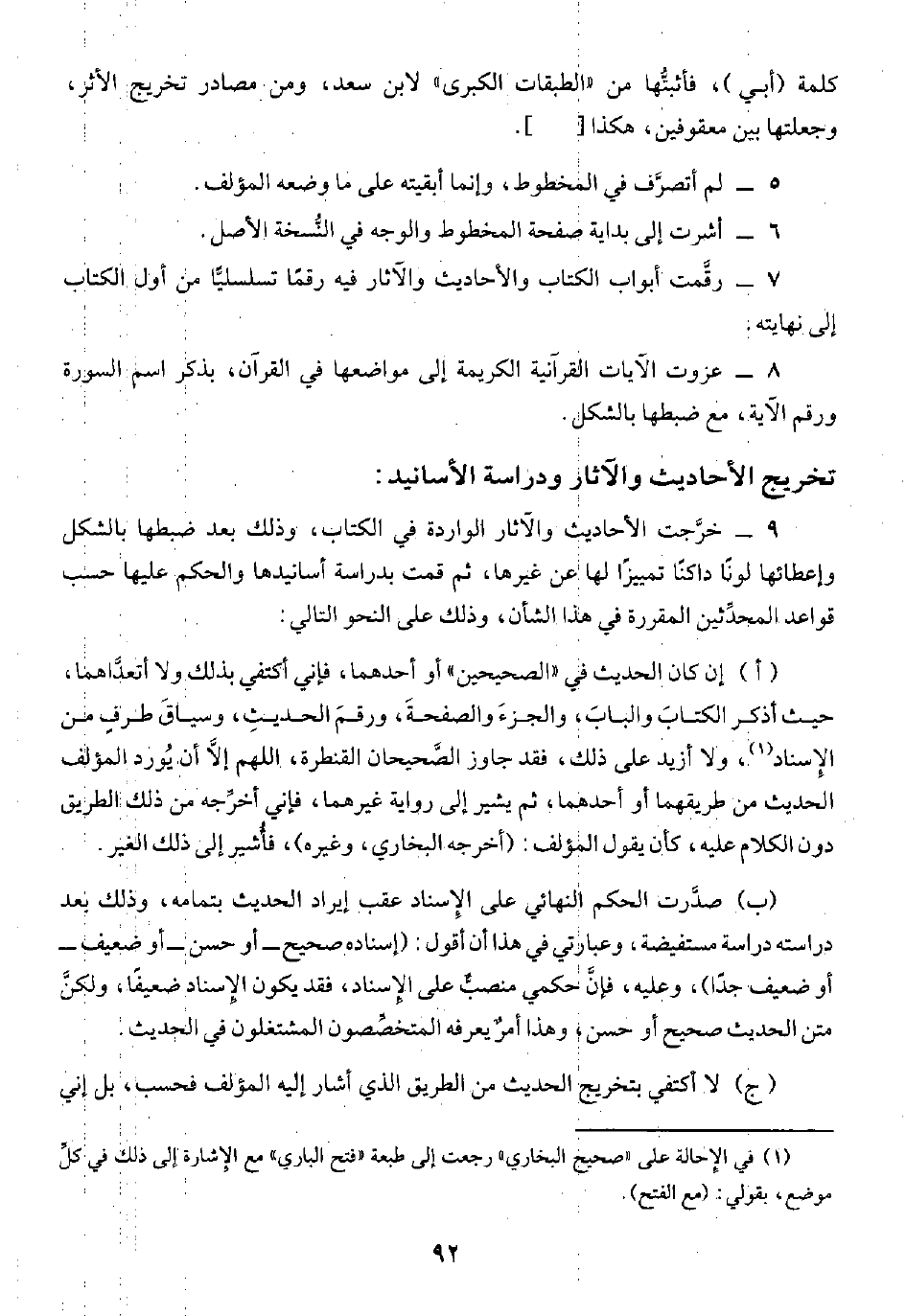 ٩ - خرَّجت الأحاديث والآثار الواردة في الكتاب، وذلك بعد ضبطها بالشكل وإعطائها لونًا داكنًا تمييزًا لها عن غيرها، ثم قمت بدراسة أسانيدها والحكم عليها حسب قواعد المحدِّثين المقررة في هذا الشأن، وذلك على النحو التالي: