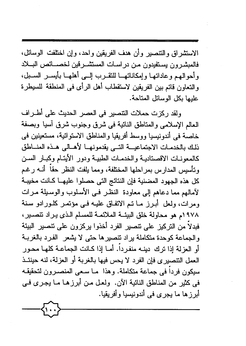 الاستشراق والتنصير وأن هدف الفريقين واحد، وإن اختلفت الوسائل، فالمبشرون يستفيدون من دراسات المستشرقين لخصائص البلاد وأحوالهم وعاداتها وإمكاناتها للتقرب إلى أهلها بأيسر السبل، والتعاون قائم بين الفريقين لاستقطاب أهل الرأي في المنطقة للسيطرة عليها بكل الوسائل المتاحة.