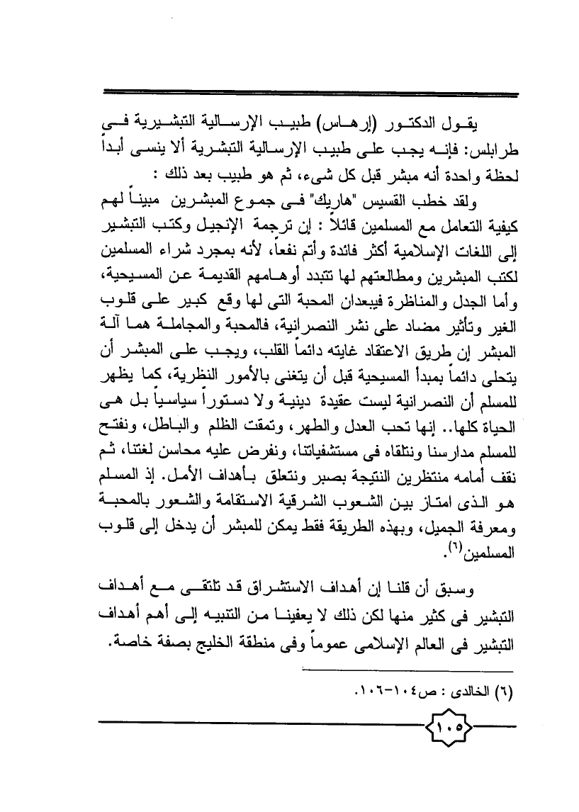 وسبق أن قلنا إن أهداف الاستشراق قد تلتقي مع أهداف التبشير في كثير منها لكن ذلك لا يعفينا من التنبيه إلى أهم أهداف التبشير في العالم الإسلامي عموما وفي منطقة الخليج بصفة خاصة.