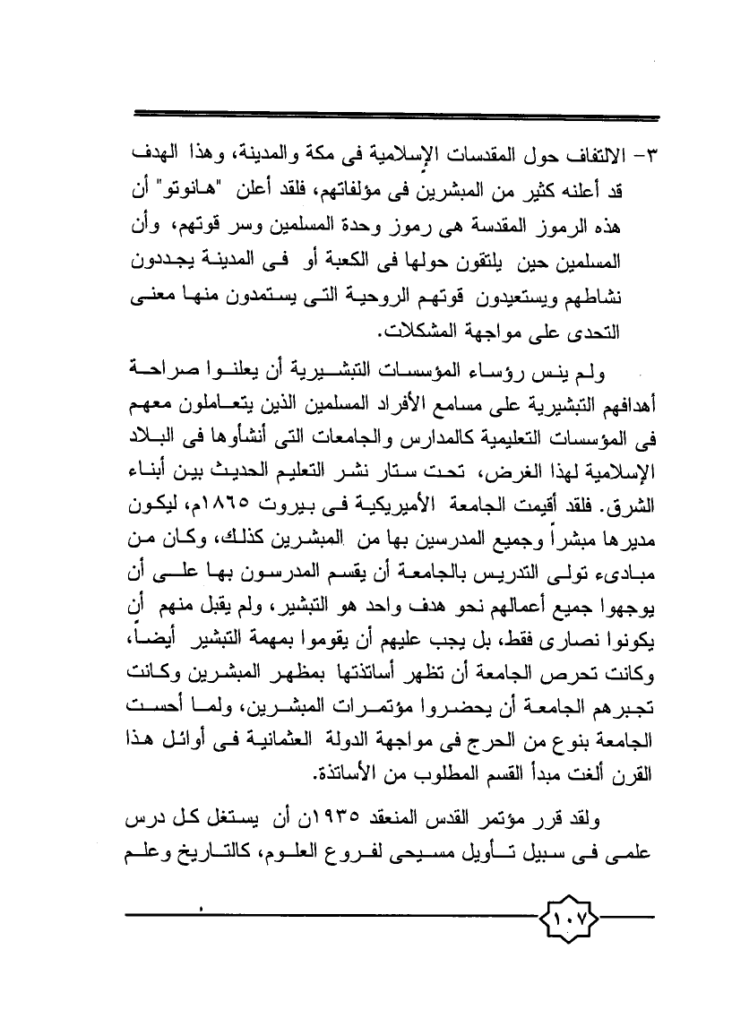 3- الالتفاف حول المقدسات الإسلامية في مكة والمدينة، وهذا الهدف قد أعلنه كثير من المبشرين في مؤلفاتهم، فلقد أعلن "هانوتو" أن هذه الرموز المقدسة هي رموز وحدة المسلمين وسر قوتهم، وأن المسلمين حين يلتقون حولها في الكعبة أو في المدينة يجددون نشاطهم ويستعيدون قوتهم الروحية التي يستمدون منها معنى التحدي على مواجهة المشكلات.
