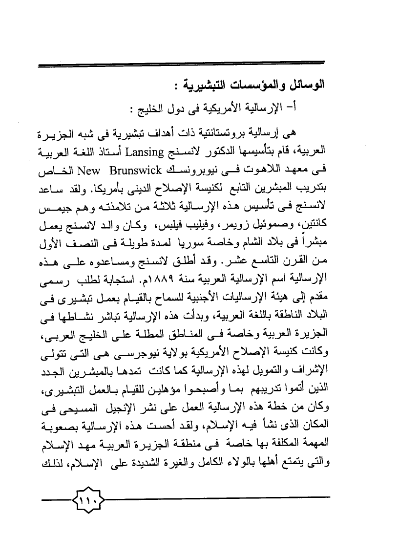 هي إرسالية بروتستانتية ذات أهداف تبشيرية في شبة الجزيرة العربية، قام بتأسيسها الدكتور لانسنج LANSING أستاذ اللغة العربية في معهد اللاهوت في نيوبرونسك NEW BRUNSWICK الخاص بتدريب المبشرين التابع لكنيسية الإصلاح الديني بأمريكا، ولقد ساعد لانسنج في تأسيس هذه الإرسالية ثلاثة من تلامذته وهم جيمس كانتين، وصموئيل زويمرن وفيليب فيلبس، وكان والد لانسنج يعمل مبشرًا في بلاد الشام وخاصة سوريا لمدة طويلة في النصف الأول من القرن التاسع عشر، وقد أطلق لانسنج ومساعدوه على هذه الإرسالية اسم الإرسالية العربية سنة 1889م. استجابة لطلب رسمي مقدم إلى هيئة الإرساليات الأجنبية للسماح بالقيام بعمل تبشيري في البلاد الناطقة باللغة العربية، وبدأت هذه الإرسالية تباشر نشاطها في الجزيرة العربية وخاصة في المناطق المطلة على الخليج العربي، وكانت كنيسة الإصلاح الأمريكية بولاية نيوجيرسي هي التي تتولى الإشراف والتمويل لهذه الإرسالية كما كانت تمدها بالمبشرين الجدد الذين أتموا تدريبهم بها وأصبحوا مؤهلين للقيام بالعمل التبشيري، وكان من خطة هذه الإرسالية العمل على نشر الإنجيل المسيحي في المكان الذي نشأ فيه الإسلام، ولقد أحست هذه الإرسالية بصعوبة المهمة المكلفة بها خاصة في منطقة الجزيرة العربية مهد الإسلام والتي يتمتع أهلها بالولاء الكامل والغيرة الشديدة على الإسلام، لذلك