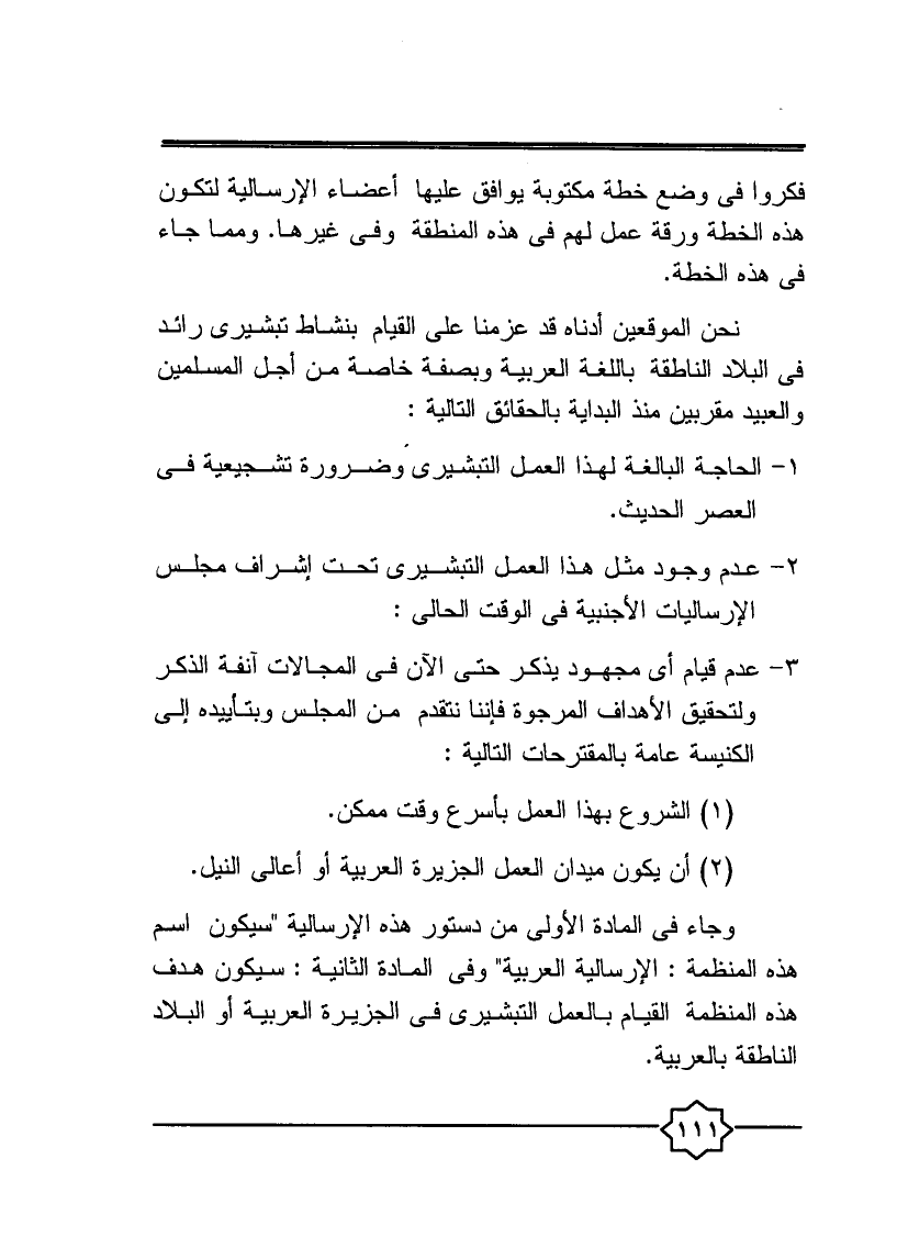 "نحن الموقعين أدناه قد عزمنا على القيام بنشاط تبشيري رائد في البلد الناطقة باللغة العربية وبصفة خاصة من أجل المسلمين العبيد مقرين منذ البداية بالحقائق التالية: