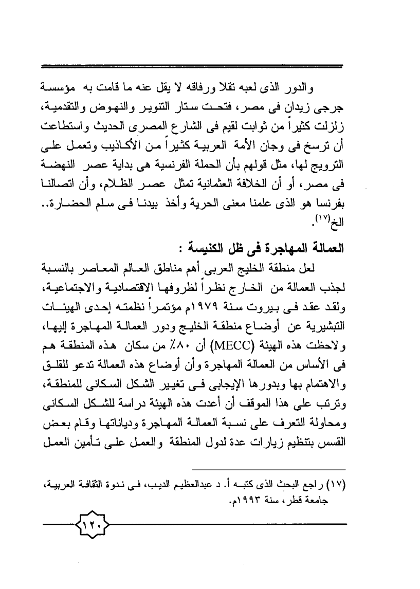 لعل منطقة الخليج العربي أهم مناطق العالم المعاصر بالنسبة لجذب العمالة من الخارج نظرا لظروفها الاقتصادية والاجتماعية ولقد عقد في بيروت سنة 1979م مؤتمرا نظمته إحدى الهيئات التبشيرية هذه "MECC" أن 80% من سكان هذه المنطقة هم في الأساس من العمالة المهاجرة وأن أوضاع هذه العمالة تدعو للقلق في الأساس من العمالة المهاجرة وأن أوضاع هذه العمالة تدعو للقلق والاهتمام بها وبدورها الإيجابي في تغيير الشكل السكاني للمنطقة، وترتب على هذا الموقف أن أعدت هذه الهيئة دراسة للشكل السكاني ومحاولة التعرف على نسبة العمالة المهاجرة ودياناتها وقام بعض القسس بتنظيم زيارات عدة لدول المنطقة والعمل على تأمين العمل