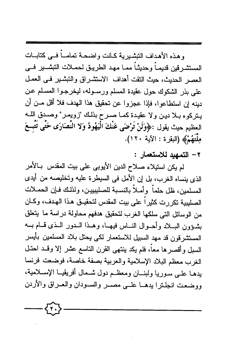 وهذه الأهداف التبشيرية كانت واضحة تماما في كتابات المستشرقين قديما وحديثا مما مهد الطريق لحملات التبشير في العصر الحديث، حيث التقت أهداف الاستشراق والتبشير في العمل على بذر الشكوك حول عقيدة المسلم ورسوله؛ ليخرجوا المسلم عن دينه إن استطاعوا، فإذا عجزوا عن تحقيق هذا الهدف فلا أقل من أن يتركوه بلا دين ولا عقيدة كما صرح بذلك "زويمر" وصدق الله العظيم حيث يقول: {وَلَنْ تَرْضَى عَنْكَ الْيَهُودُ وَلا النَّصَارَى حَتَّى تَتَّبِعَ مِلَّتَهُمْ} [البقرة: الآية 120] .