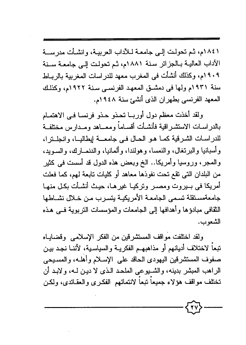 ولقد أخذت معظم دول أوربا تحذو حذو فرنسا في الاهتمام بالدراسات الاستشراقية فأنشأت أقساما ومعاهد ومدارس مختلفة للدراسات الشرقية كما هو الحال في جامعة إيطاليا، وانجلترا، وأسبانيا والبرتغال، والنمسا، وهولندا، وألمانيا، والدنمارك، والسويد، والمجر، وروسيا، وأمريكا.. إلخ، وبعض هذه الدول قد أسست في كثير من البلدان التي تقع تحت نفوذها معاهد أو كليات تابعة لهم، كما فعلت أمريكا في بيروت ومصر وتركيا، غيرها، حيث أنشأت بكل منها جامعة مستقلة تسمى الجامعة الأمريكية يتسرب من خلال نشاطها الثقافي مبادؤها وأهدافها إلى الجامعات والمؤسسات التربوية في هذه الشعوب.