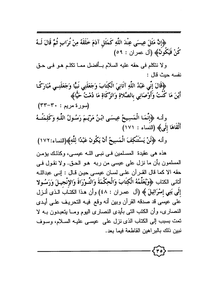 هذه هي عقيدة المسلمين في نبي الله عيسى، وكذلك يؤمن المسلمون بأن ما نزل على عيسى من ربه هو الحق، ولا نقول في حقه إلا كما قال القرآن على لسان عيسى حين قال: إني عبد الله أتاني الكتاب {وَيُعَلِّمُهُ الْكِتَابَ وَالْحِكْمَةَ وَالتَّوْرَاةَ وَالْأِنْجِيلَ، وَرَسُولًا إِلَى بَنِي إِسْرائيلَ} [آل عمران: 48] ، وأن هذه الكتاب الذي أنزل على عيسى قد صدقه القرآن وبين أنه وقع فيه التحريف على أيدي النصارى، وأن الكتب التي بأيدي النصارى اليوم وما يتعبدون به لا تمت بسبب إلى الكتاب الذي نزل على عيسى عليه السلام، وسوف نبين ذلك بالبراهين القاطعة فيما بعد.