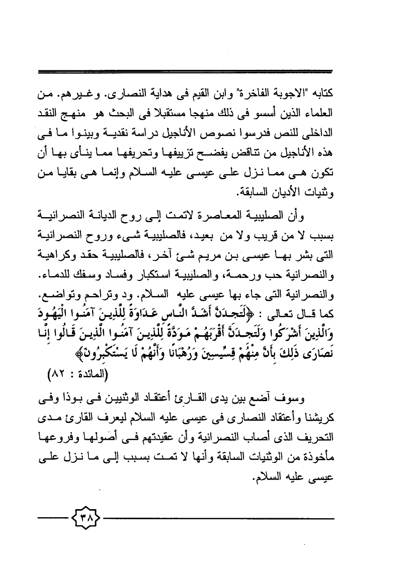 كتابه "الأجوبة الفاخرة" وابن القيم في هداية النصارى، وغيرهم من العلماء الذين أسسوا في ذلك منهجا مستقبلا في البحث هو منهج النقد الداخلي للنص فدرسوا نصوص الأناجيل دراسة نقدية وبينوا ما في هذه الأناجيل من تناقض يفضح تزييفها وتحريفها مما ينأى بها أن تكون هي مما نزل على عيسى -عليه السلام- وإنما هي بقايا من وثنيات الأديان السابقة.
