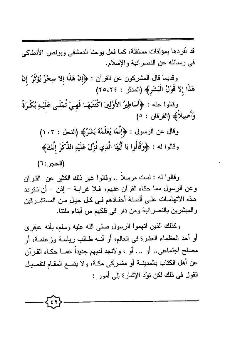 وكذلك الذين اتهموا الرسول صلى الله عليه وسلم بأنه عبقري أو أحد العظماء العشرة في العالم، أو أنه طالب رياسة وزعامة، أو مصلح اجتماعي ... أو ... أو، ولا نجد لديهم جديدًا عما حكاه القرآن عن أهل الكتاب بالمدينة أو مشركي مكة، ولا يتسع المقام لتفصيل القول في ذلك لكن نود الإشارة إلى أمور:
