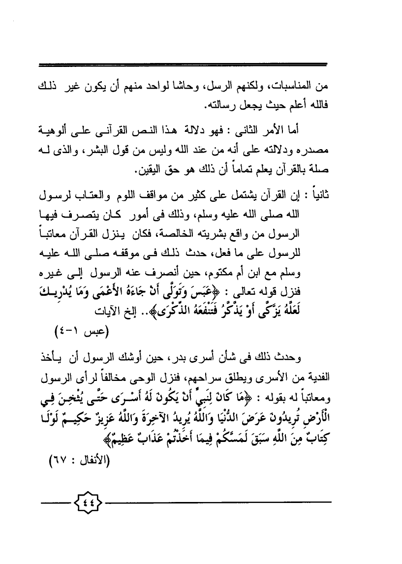 ثانيًا: إن القرآن يشتمل على كثير من مواقف اللوم والعتاب لرسول الله صلى الله عليه وسلم، وذلك في أمور كان يتصرف فيها الرسول من واقع بشريته الخالصة، فكان ينزل القرآن معاتبا للرسول على ما فعل، حدث ذلك في موقفه صلى الله عليه وسلم مع ابن أم مكتوم، حين انصرف عنه الرسول إلى غيره، فنزل قوله تعالى: {عَبَسَ وَتَوَلَّى، أَنْ جَاءَهُ الْأَعْمَى، وَمَا يُدْرِيكَ لَعَلَّهُ يَزَّكَّى، أَوْ يَذَّكَّرُ فَتَنْفَعَهُ الذِّكْرَى} ... إلخ الآيات [عبس: 1-4] .