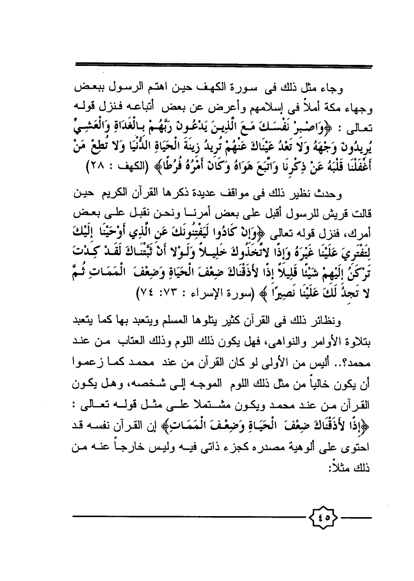ونظائر ذلك في القرآن كثير يتلوها المسلم ويتعبد بها كما يتبعد بتلاوة الأوامر والنواهي، فهل يكون ذلك اللوم وذلك العتاب من عند محمد؟.. أليس من الأولى لو كان القرآن من عند محمد كما زعموا أن يكون خاليا من مثل ذلك اللوم الموجه إلى شخصه، وهل يكون القرآن من عند محمد، ويكون مشتملا على مثل قوله تعالى: {إِذًا لَأَذَقْنَاكَ ضِعْفَ الْحَيَاةِ وَضِعْفَ الْمَمَاتِ} إن القرآن نفسه قد احتوى على ألوهية مصدره كجزء ذاتي فيه وليس خارجا عنه من ذلك مثلا: