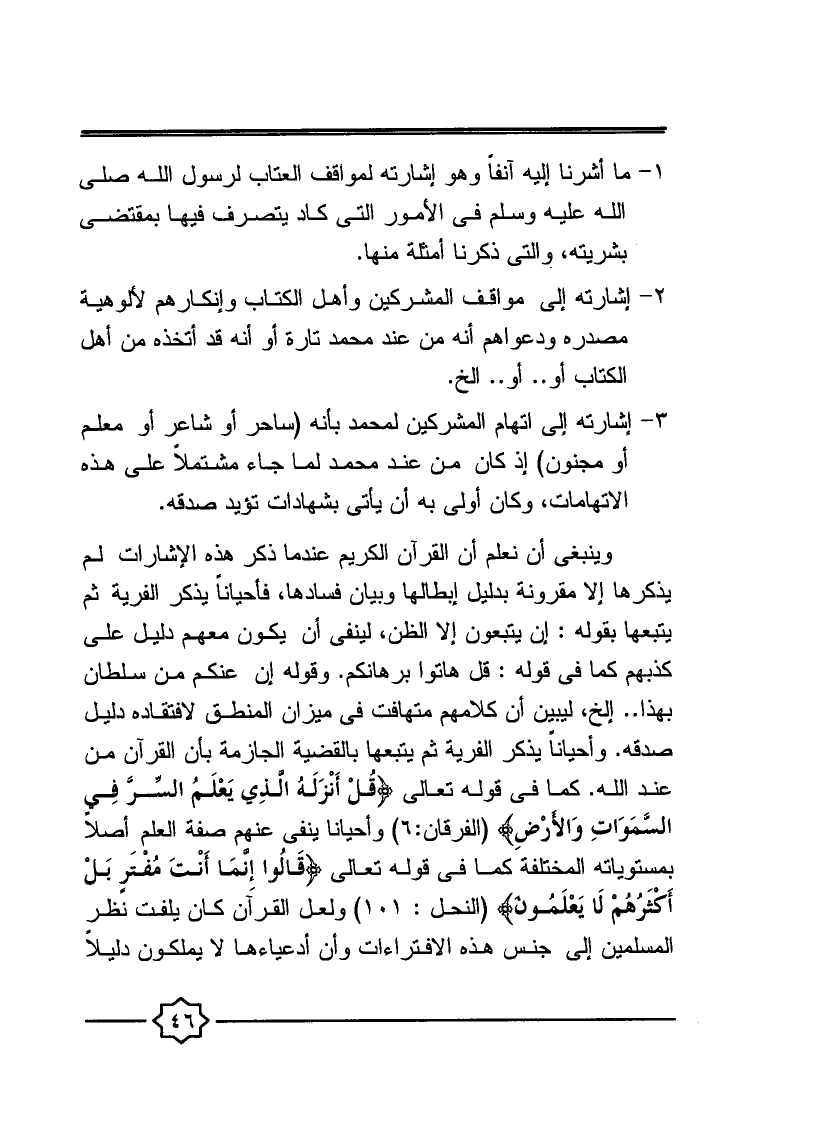 وينبغي أن نعلم القرآن الكريم عندما ذكر هذه الإشارات لم يذكرها إلا مقرونة بدليل إبطالها وبيان فسادها، فأحيانا يذكر الفرية، ثم يتبعها بقوله: إن يتبعون إلا الظن؛ لينفي أن يكون معهم دليل على كذبهم كما في قوله: {قُلْ هَاتُوا بُرْهَانَكُمْ} ، وقوله: {إِنْ عِنْدَكُمْ مِنْ سُلْطَانٍ بِهَذَا} ... إلخ؛ ليبين أن كلامهم متهافت في ميزان المنطق؛ لافتقاد دليل صدقه، وأحيانا يذكر الفرية ثم يتبعها بالقضية الجازمة بأن القرآن من عند الله، كما في قوله تعالى: {قُلْ أَنْزَلَهُ الَّذِي يَعْلَمُ السِّرَّ فِي السَّمَاوَاتِ وَالْأَرْضِ} [الفرقان: 6] ، وأحيانا ينفي عنهم صفة العلم أصلا بمستوياته المختلفة كما في قوله تعالى: {قَالُوا إِنَّمَا أَنْتَ مُفْتَرٍ بَلْ أَكْثَرُهُمْ لا يَعْلَمُونَ} [النحل: 101] ، ولعل القرآن كان يلفت نظر المسلمين إلى جنس هذه الافتراءات وأن أدعياءها لا يملكون دليلا