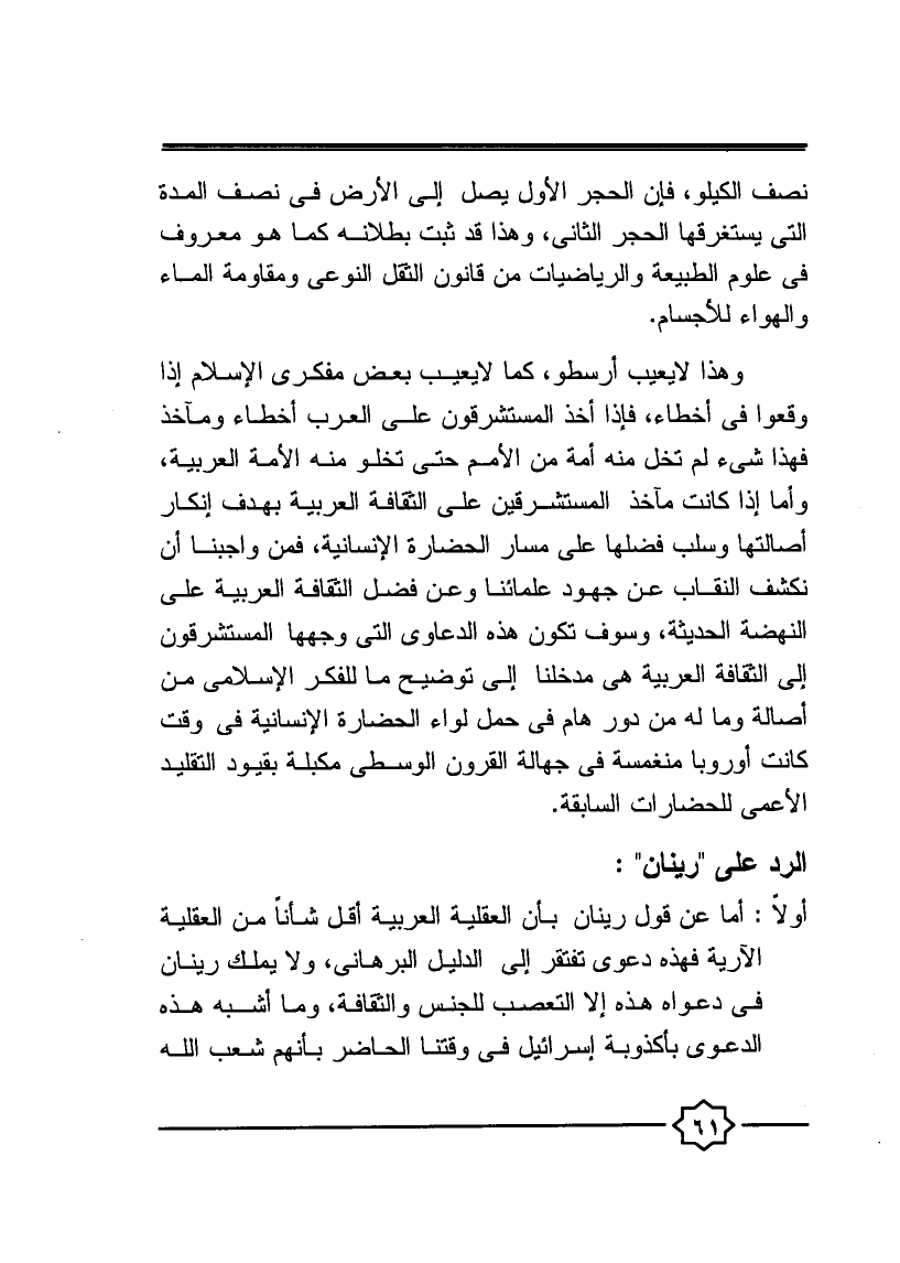 وهذا لا يعيب أرسطو، كما لا يعيب بعض مفكري الإسلام إذا وقعوا في أخطاء، فإذا أخذ المستشرقون على العرب أخطاء ومآخذ، فهذا شيء لم تخل منه أمة من الأمم حتى تخلو منه الأمة العربية، وأما إذا كانت مآخذ المستشرقين على الثقافة العربية بهدف إنكار أصالتها وسلب فضلها على مسار الحضارة الإنسانية، فمن واجبنا أن نكشف النقاب عن جهود علمائنا وعن فضل الثقافة العربية على النهضة الحديثة، وسوف تكون هذه الدعاوى التي وجهها المستشرقون إلى الثقافة العربية هي مدخلنا إلى توضيح ما للفكر الإسلامي من أصالة وما له من دور هام في حمل لواء الحضارة الإنساية في وقت كانت أوروبا منغمسة في جهالة القرون الوسطى مكبلة بقيود التقليد الأعمى للحضارات السابقة.