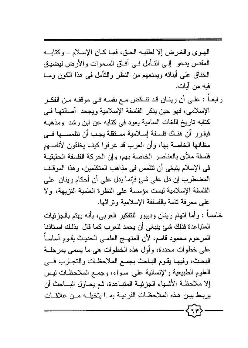 رابعًا: على أن رينان قد تناقض مع نفسه في موقفه من الفكر الإسلامي، فهو حين ينكر الفلسفة الإسلامية ويجحد أصالتها في كتابه تاريخ اللغات السامية يعود في كتابه عن ابن رشد ومذهبه، فيقرر أن هناك فلسفة إسلامية مستقلة يجب أن نتلمسها في مظانها الخاصة بها، وأن العرب قد عرفوا كيف يخلقون لأنفسهم فلسفة ملأى بالعناصر الخاصة بهم، وإن الحركة الفلسفية الحقيقية في الإسلام ينبغي أن تتلمس في مذاهب المتكلمين، وهذا الموقف المضطرب إن دلَّ على شيء؛ فإنما يدل على أن أحكام رينان على الفلسفة الإسلامية ليست مؤسسة على النظرة العلمية النزيهة، ولا على معرفة تامة بالفلسفة الإسلامية وتراثها.