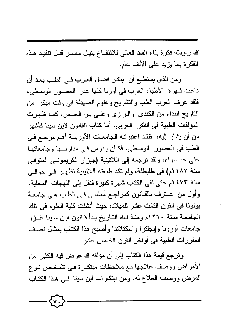 ومن الذي يستطيع أن ينكر فضل العرب في الطب بعد أن ذاعت شهرة الأطباء العرب في أوربا كلها عبر العصور الوسطى، فلقد عرف العرب الطب والتشريح وعلوم الصيدلة في وقت مبكر من التاريخ ابتداء من الكندي والرازي وعلي بن العباس، كما ظهرت المؤلفات الطبية في الفكر العربي، أما كتاب القانون لابن سينا فأشهر من أن يشار إليه، فلقد اعتبرته الجامعات الأوروبية أهم مرجع في الطب في العصور الوسطى، فكان يدرَّس في مدارسها وجامعاتها على حد سواء، ولقد ترجمه إلى اللاتينية "جيزار الكريموني المتوفى سنة 1187م" في طليطة، ولم تكد طبعته اللاتينية تظهر في حوالي سنة 1473م حتى لقي الكتاب شهرة كبيرة فنقل إلى اللهجات المحلية وأول من اعتراف بالقانون كمراجع أساسي في الطب هي جامعة بولونا في القرن الثالث عشر للميلاد، حيث أنشئت كلية العلوم في تلك الجامعة سنة 1260م ومنذ ذلك التاريخ بدأ قانون ابن سينا غزو جامعات أوربا وإنجلترا واسكتلاندا، وأصح هذا الكتاب يمثل نصف المقررات الطبية في أواخر القرن الخامس عشر.