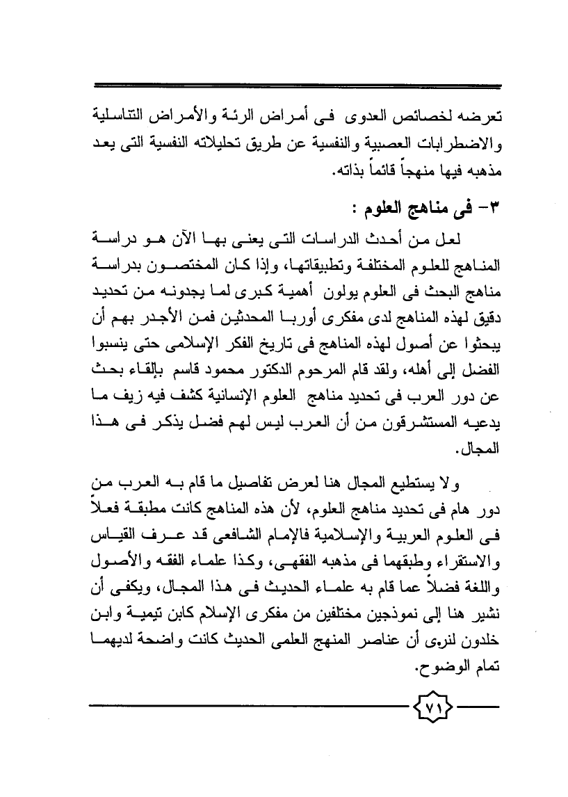 ولا يتسع المجال هنا لعرض تفاصيل ما قام به العرب من دور هام في تحديد مناهج العلوم؛ لأن هذه المناهج كانت مطبقة فعلا في العلوم العربية والإسلامية فالإمام الشافعي قد عرف القياس والاستقراء وطبقهما في مذهبه الفقهي، وكذا علماء الفقه والأصول واللغة فضلا عما قام به علماء الحديث في هذا المجال، ويكفي أن نشير هنا إلى نموذجين مختلفين من مفكري الإسلام كابن تيمية وابن خلدون لنرى أن عناصر المنهج العلمي الحديث كانت واضحة لديهما تمام الوضوح.