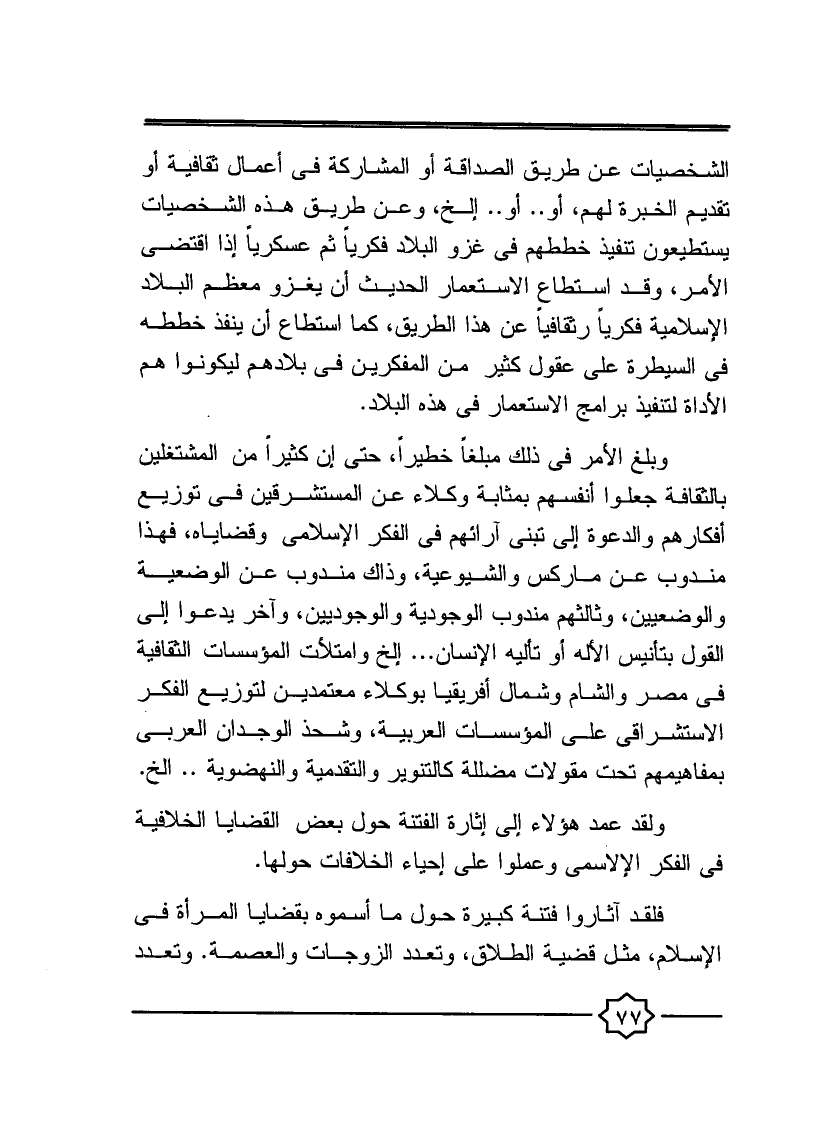 فلقد أثاروا فتنة كبيرة حول ما أسموه بقضايا المرأة في الإسلام، مثل قضية الطلاق، وتعدد الزوجات، والعصمة، وتعدد