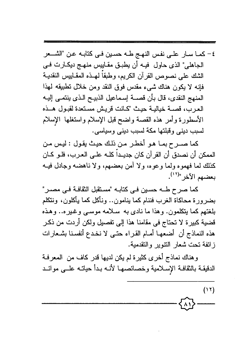 4- كما سار على نفس النهج طه حسين في كتبه عن "الشعر الجاهلي" الذي حاول فيه أن يطبق مقاييس منهج ديكارت في الشك على نصوص القرآن الكريم، وطبقا لهذه المقاييس النقدية فإنه لا يكون هناك شيء مقدس فوق النقد ومن خلال تطبيقه لهذا المنهج النقدي، قال بأن قصة إسماعيل الذبيح الذي ينتمي إليه العرب، قصة خيالية حيث "كانت قريش مستعدة لقبول هذه الأسطورة وأمر هذه القصة واضح قبل الإسلام واستغلها الإسلام؛ لسبب ديني وقبلتها مكة لسبب ديني وسياسي".