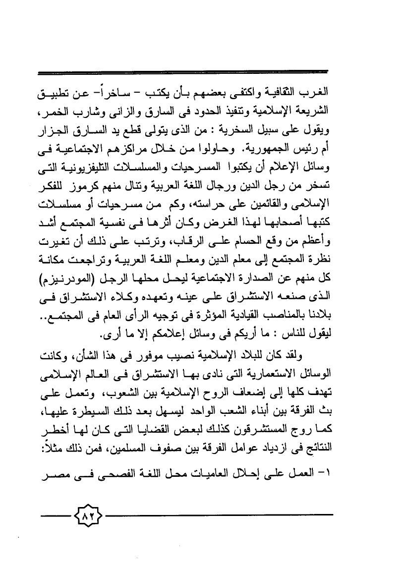 الغرب الثقافية، واكتفى بعضهم بأن يكتب -ساخرا- عن تطبيق الشريعة الإسلامية وتنفيذ الحدود في السارق والزاني وشارب الخمر، ويقول على سبيل السخرية: من الذي يتولى قطع يد السارق الجزار أم رئيس الجمهورية؟ وحاولوا من خلال مراكزهم الاجتماعية في وسائل الإعلام أن يكتبوا المسرحيات والمسلسلات التليفزيونية التي تسخر من رجل الدين ورجال اللغة العربية، وتنال منهم كَرُمُوز للفكر الإسلامي والقائمين على حراسته، وكم من مسرحيات أو مسلسلات كتبها أصحابها لهذا الغرض وكان أثرها في نفسية المجتمع أشد وأعظم من وقع الحسام على الرقاب، وترتب على ذلك أن تغيرت نظرة المجتمع إلى معلِّم الدين ومعلم اللغة العربية وتراجعت مكانة كل منهم عن الصدارة الاجتماعية؛ ليحل محلها الرجل "المودرنيزم" الذي صنعه الاستشراق على عينه، وتعهده وكلاء الاستشراق في بلادنا بالمناصب القيادية المؤثرة في توجيه الرأي العام في المجتمع؛ ليقول الناس: ما أريكم في وسائل إعلامكم إلا ما أرى.