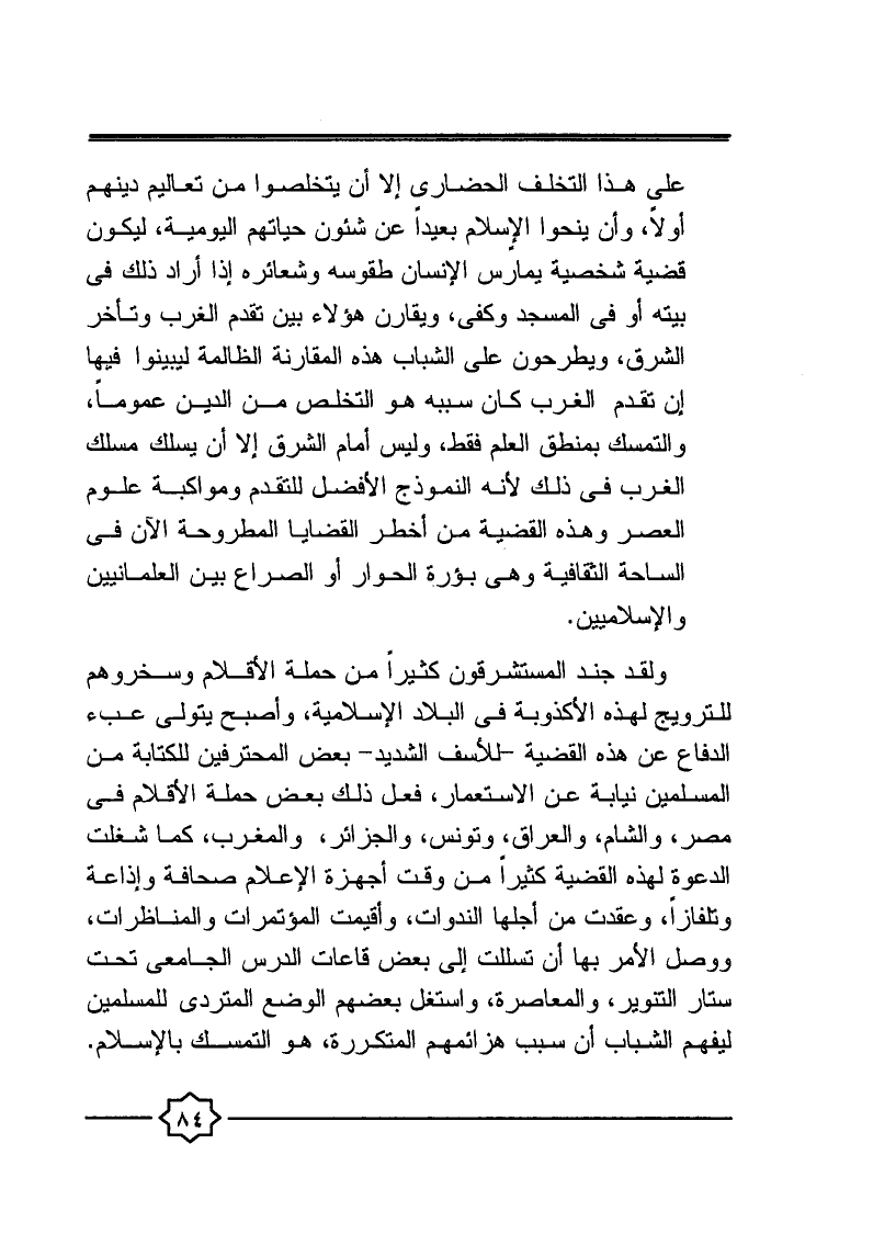 على هذا التخلف الحضاري إلا أن يتخلصوا من تعاليم دينهم أولا، وأن ينحوا الإسلام بعيدا عن شئون حياتهم اليومية؛ ليكون قضية شخصية يمارس الإنسان طقوسه وشعائره إذا أراد ذلك في بيته أو في المسجد وكفى، ويقارن هؤلاء بين تقدم العرب وتأخر الشرق، ويطرحون على الشباب هذه المقارنة الظالمة؛ ليبينوا فيها أن تقدم العرب كان سببه هو التخلص من الدين عمومًا والتمسك بمنطق العلم فقط وليس أمام الشرق إلا أن يسلك مسلك الغرب في ذلك؛ لأنه النموذج الأفضل للتقدم ومواكبة وعلوم العصر، وهذه القضية من أخطر القضايا المطروحة الآن في الساحة الثقافية وهي بؤرة الحوار أو الصراع بين العلمانيين والإسلاميين.