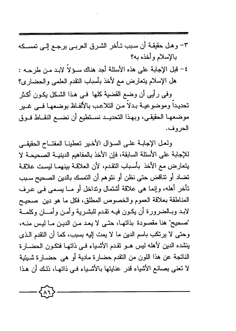 3- وهل حقيقة أن سبب تأخر الشرق العربي يرجع إلى تمسكه بالإسلام وأخذه به؟