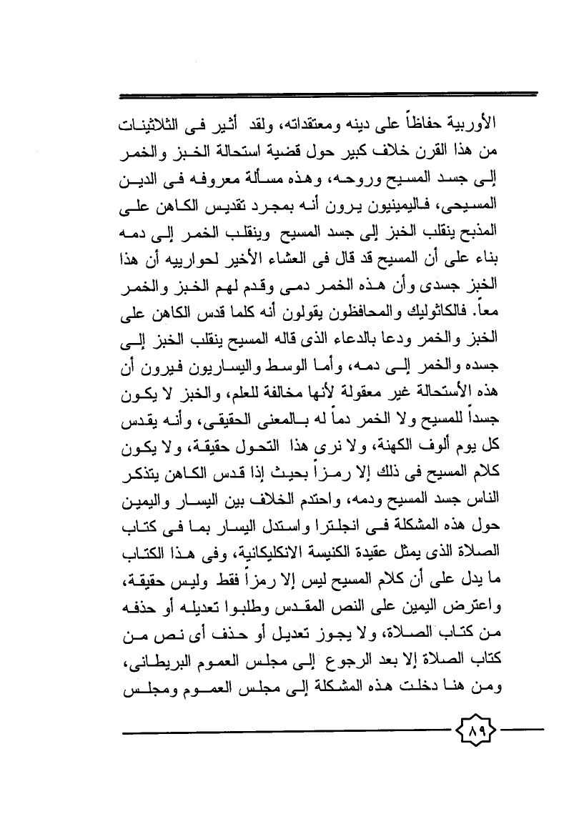 الأوربية حفاظا على دينه ومعتقداته، ولقد أثير في الثلاثينات من هذا القرن خلاف كبير حول قضية استحالة الخبز والخمر إلى جسد المسيح وروحه، وهذه المسألة معروفة في الدين المسيحي، فاليمينيون يرون أنه بمجرد تقديس الكاهن على المذبح ينقلب الخبز إلى جسد المسيح وينقلب الخمر إلى دمه بناء على أن المسيح قد قال في العشاء الأخير لحوارييه: إن هذا الخبز جسدي وإن هذه الخمر دمي، وقدم لهم الخبز والخمر معا. فالكاثوليك والمحافظون يقولون أنه كلما قدس الكاهن على الخبز والخمر ودعا بالدعاء الذي قاله المسيح ينقلب الخبز إلى جسده والخمر إلى دمه، وأما الوسط واليساريون فيرون أن هذه الاستحالة غير معقولة؛ لأنها مخالفة للعلم، والخبز لا يكون جسدًا للمسيح ولا الخمر دمًا له بالمعنى الحقيقي، وأنه يقدس كل يوم ألوف الكهنة، ولا نرى هذا التحول حقيقة، ولا يكون كلام المسيح في ذلك إلا رمزا بحيث إذا قدس الكاهن يتذكر الناس جسد المسيح ودمه، واحتدم الخلاف بين اليسار واليمين حول هذه المشكلة في انجلترا واستدل اليسار بما في كتاب الصلاة الذي يمثل عقيدة الكنيسة الإثكليكانية، وفي هذا الكتاب ما يدل على أن كلام المسيح ليس إلا رمزا فقط وليس حقيقة، واعترض اليمين على النص المقدس وطلبوا تعديله أو حذفه من كتاب الصلاة، ولا يجوز تعديل أو حذف أي نص من كتاب الصلاة إلا بعد الرجوع إلى مجلس العموم البريطاني ومن هنا دخلت هذه المشكلة إلى مجلس العموم ومجلس