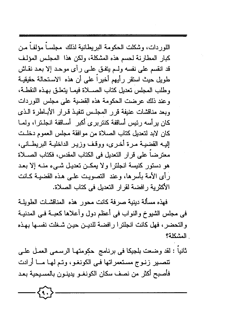 اللوردات، وشكلت الحكومة البريطانية لذلك مجلسا مؤلفا من كبار المطارنة؛ لحسم هذه المشكلة، ولكن هذا المجلس المؤلف قد انقسم على نفسه، ولم يتفق على رأي موحد إلا بعد نقاش طويل حيث استقر رأيهم أخيرا على أن هذه الاستحالة حقيقية، وطلب المجلس تعديل كتاب الصلاة فيما يتعلق بهذه النقطة، وعند ذلك عرضت الحكومة هذه القضية على مجلس اللوردات وبعد مناقشات عنيفة قرر المجلس تنفيذ قرار الأباطرة الذي كان يرأسه رئيس أساقفة كنتربري أكبر أساقفة انجلترا، ولما كان لا بد لتعديل كتاب الصلاة من مواقفة مجلس العموم دخلت إليه القضية مرة أخرى، ووقف وزير الداخلية البريطاني، معترضا على قرار التعديل في الكتاب المقدس، فكتاب الصلاة هو دستور كنيسة انجلترا ولا يمكن تعديل شيء منه إلا بعد رأي الأمة بأسرها، وعند التصويت على هذه القضية كانت الأكثرية رافضة لقرار التعديل في كتاب الصلاة.