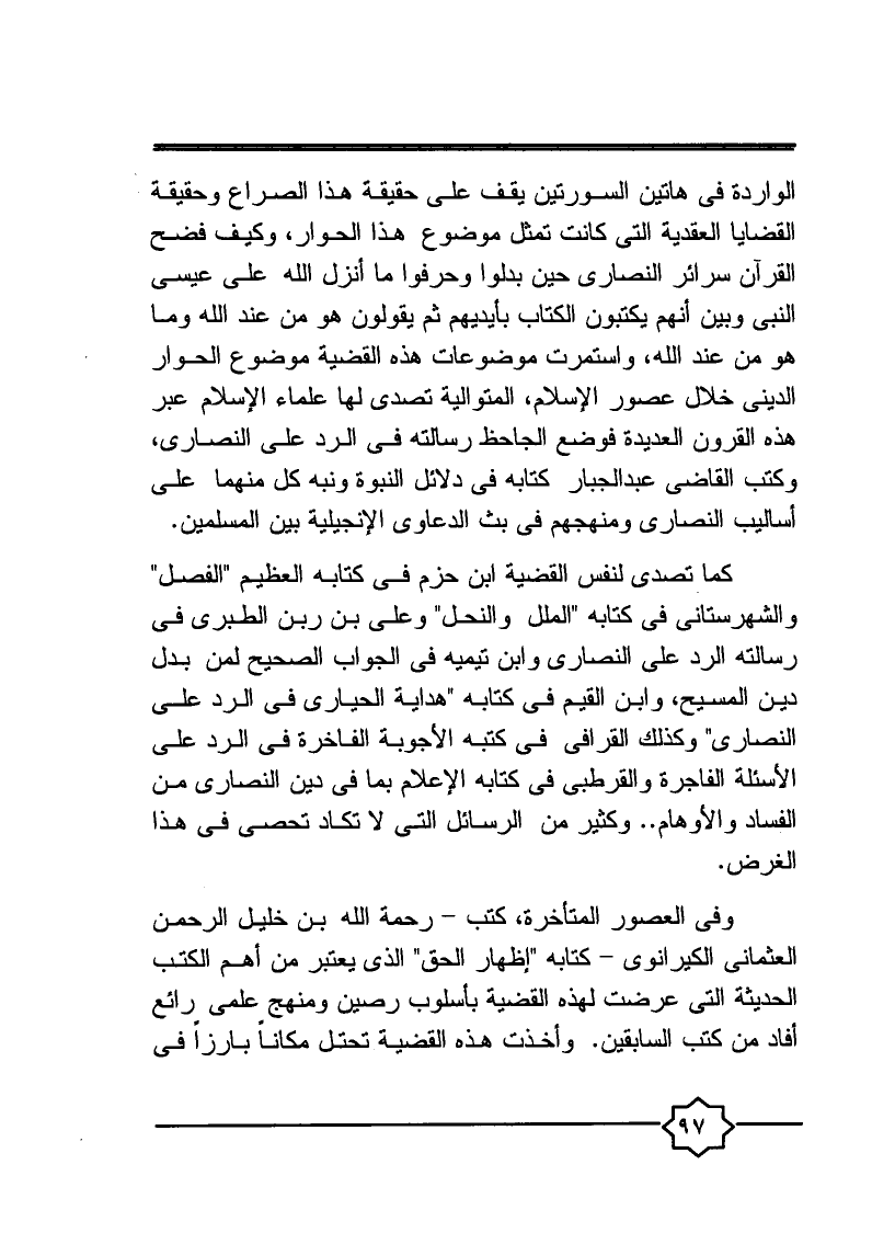 الواردة في هاتين السورتين يقف على حقيقة هذا الصراع، وحقيقة القضايا العقدية التي كانت تمثل موضوع هذا الحوار، وكيف فضح القرآن سرائر النصارى حين بدلوا وحرَّفوا ما أنزل الله على عيسى النبي، وبين أنهم يكتبون الكتاب بأيديهم، ثم يقولون هو من عند الله وما هو من عند الله، واستمرت موضوعات هذه القضية موضوع الحوار الديني خلال عصور الإسلام المتوالية، تصدى لها علماء الإسلام عبر هذه القرون العديدة، فوضع الجاحظ رسالته في الرد على النصارى، وكتب القاضي عبد الجبار كتابه في دلائل النبوة، ونبه كل منهما على أساليب النصارى ومنهجهم في بث الدعاوي الإنجيلية بين المسلمين.